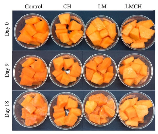 Additionally, the application of ECs significantly increased (p < 0.05) the firmness of LM-coated cantaloupe from 19.20 to 28.32 N (day 0; Table 1). During storage time, a decrease in firmness “tissue softening” was observed in LM-, LMCH-coated, and control samples, without significant differences (p > 0.05) between days 3 and 18. Nonetheless, coated cantaloupe pieces showed slightly higher firmness values compared to control samples (Table 1). In addition, the fluctuations found in firmness values between the different days of evaluation could be related to the inherent variability of the fruit. On the other hand, CH-coated fruit presented the highest and stable firmness values during the total storage time (p < 0.05; Table 1). A similar effect has been reported in previous studies [,,]. Compared to previous studies, lower firmness values have been reported on fresh-cut cantaloupe coated with pectin [], cellulose [], carboxymethylcellulose [], and alginate []. Conversely, higher values have been reported using multilayered ECs with the formula CH/pectin/trans-cinnamaldehyde [].