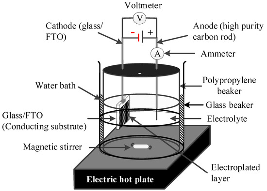 Cadmium telluride thin-films were electrodeposited from a solution containing 1.5 M cadmium nitrate tetrahydrate (Cd(NO3)2·4H2O) and 0.002 M tellurium oxide (TeO2). The respective precursors for Cd and Te were dissolved in 400 mL of deionized (DI) water contained in a polypropylene beaker using the set up depicted in Figure 1. The resulting aqueous solution will be referred to as CdTe-bath henceforth in this report. Using these precursor concentrations and electrolytic cell set up, four electrolytic baths were created. To achieve a transparent and homogenous solution, the baths were stirred for about 300 min.