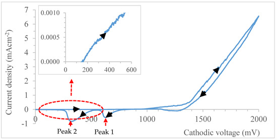 Tellurium is deposited first because it is more positive as compared to cadmium with respective standard reduction potential value of +593 mV and −403 mV with respect to standard H2 electrode. From the inset of Figure 2, Te starts depositing at a cathodic voltage of ~170 mV and above, while Cd starts deposition at 1000 mV. Details of the optimization process have been documented by the author’s group in the literature [12,17].
