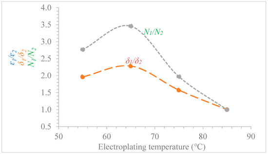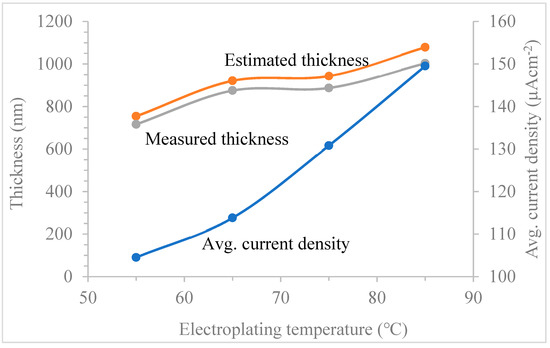 For this experiment, the deposition duration was maintained at 180 min for each of the electroplated CdTe at different deposition temperatures. Figure 5 shows the graphical plot of both the estimated and the measured thicknesses including the average deposition current density of the CdTe layers against the deposition temperature. For the estimated thickness using the Faraday’s equation (see Equation (4)), the rise in the thickness of electrodeposited CdTe with increasing deposition temperature was solely due to the corresponding increase in the average current density of deposition. In addition, increase in the solubility of solvents and the catalyses, the reactions are also as a result of an increase in the electroplating temperature [28]. Correspondingly, this divulges an increase in the deposition current density and hence, a rapid growth rate of constituent elements or compounds.