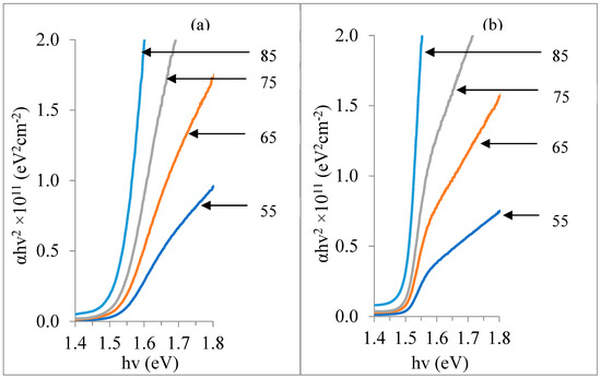 Figure 6a,b shows the Tauc’s plot of (αhv)2 against (hv) for CdTe thin-films electrodeposited at different temperatures under both AD and CCT conditions respectively. Table 3 and Figure 7 summarizes the observed bandgap energy and the absorption edge of the investigated CdTe thin-films. Under the as-deposited condition, the observed bandgaps range is within the generally acceptable range of 1.51 ± 0.03 eV for CdTe layers [29]. This follows a trend in which the highest bandgap of 1.54 eV was recorded at 55 °C and the lowest bandgap of 1.48 eV was observed at 85 °C. It is generally accepted in the photovoltaic community that the optimal bandgap 1.45 eV is required to achieve the highest efficiency of a one-bandgap p-n junction photovoltaic device.