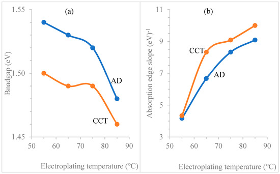 (a) A plot of optical bandgap of CdTe electroplated from electrolytes at different deposition temperature and (b) is the absorption edge slope of the CdTe layers under both AD and CCT conditions against deposition temperature.