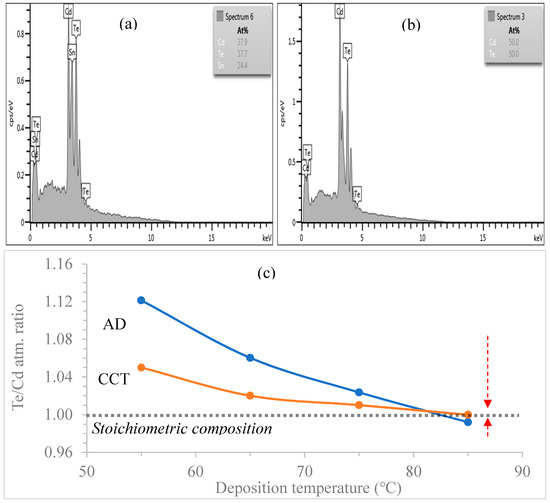 EDX spectra of CdTe grown from the 85 °C electrolyte under (a) AD, (b) CCT conditions (c) is the graphical summary of Te/Cd atomic composition ratio against electroplating temperature of CdTe for both AD and CCT samples.