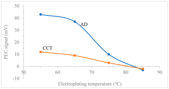 A plot of PEC signal of CdTe electroplated from electrolytes at different deposition temperatures against electroplating temperature under both AD and CCT conditions.