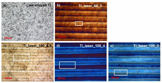 The colours were characteristic for high-temperature titanium oxides. The surface of the low alloyed Ti was mechanically treated after rolling the sheet metal (Figure 1a) by a shot peening process. The surface appearance of the laser marked Ti surface (laser 65_3) was lightly cracked (Figure 1b), as observed in a rectangle in Figure 1b. There was a significant number of impurities observed on the surface (Figure 1b). In the case of a higher production speed of a laser (Figure 1c), the surface layer was not completely melted. Traces of the original surface and minor cracks in all directions were visible (white rectangle in Figure 1c). When the laser beam with high power passed, multiple tiny cracks were formed on the surface (depicted in white rectangles in Figure 1d,e), which extended transversely to the direction of the laser beam passage. The cracks were more intensive when the power of the laser was increased and when the processing speed was lowered. The surface of the colour marked samples looked wavy, but this was not visible in the cross section (Figure 2). Cracking is, according to the literature, related to α-Ti phase formation, which is capable of dissolving ~33 at % oxygen and 23 at % nitrogen. This is reported as an oxygen-rich metallic layer, namely, Ti(O) interstitial solid [16].