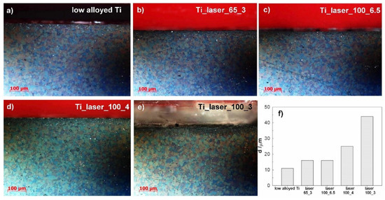 Low alloyed Ti has a typical microstructure with crystal grains oriented in all directions equally. The mechanical treatment induced the recrystallization layer, which is observed on low alloy Ti and is approximately 11 µm thick. When the surface is laser treated, the heat, produced by the laser, affects the microstructure in the upper layers to some extent. Cross-sectional examination of laser treated surfaces showed that the intensity (power) affects the depth of the changed microstructure. In addition, the effect varies with the production speed of the laser, where the depths of the affected microstructure in µm are presented in Figure 2f. The most affected microstructure, thus, was the microstructure below a surface of low alloyed Ti treated with 100% laser power and lowest production speed (laser_100_3).
