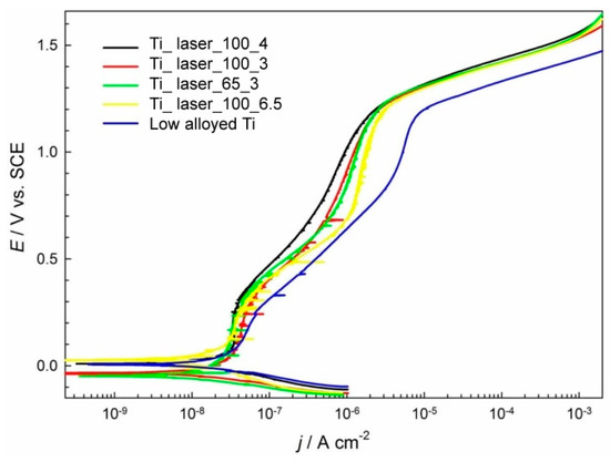 In the case of low alloyed Ti, it is clearly shown that the Ti surface exhibits passive behaviour, as observed from low passive current densities in the passive region. The breakdown potential, Eb, for low alloyed Ti is at 1.22 V and was estimated at a potential at which transpassive region with slow and steeper increase of a current density is observed (Figure 3). The current density in the pseudo passive region for non-treated low alloyed Ti is the highest among the tested samples. Samples treated with 100% laser at the highest marking speed (6%), lowest power (65%) and 3% marking speed have the second highest current density in the passive region whereas the corrosion current density is increased. Surfaces that were treated with the highest power of 100% and a smaller marking speed exhibited the smallest corrosion current density in the anodic region. Furthermore, the smallest corrosion current density jcorr was measured for 100% power and 4% marking speed at 16.7 nA·cm−2. The breakdown potential is not affected to a great extent. The passivity region ΔE (Eb − Ecorr) in Table 3 shows that the width of a passive region is wider for laser treated surfaces.