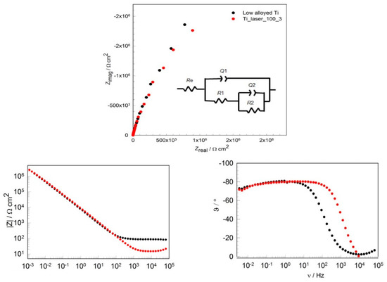 In Figure 4 the representative impedance measurements are presented in the form of a Nyquist and Bode plot for low alloyed Ti and laser treated Ti surface (laser_100_3) after 1.33 h immersion time during short term experiments. For short term experiments, the total impedance at lowest measured frequency, |Z|, for low alloyed Ti and surface treated Ti (sample Ti laser_100_3) was 2.01 and 1.98 MΩ·cm2, respectively.