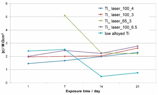 In order to observe the long-term stability of films on Ti surfaces in corrosive solutions, electrochemical impedance measurements on low alloyed Ti and surface treated Ti were conducted after 24 h and subsequently every week in 3 week exposure time. The impedance magnitude at the measured low frequency limit, |Z|f→0 (f ˂ 0.001 Hz) is presented in Figure 5. It is in the order of MΩ·cm2 at initial time and steadily increases in the case of laser treated surfaces, or decreases in the case of low alloyed Ti surface and Ti sample treated with low power and high production speed (Ti_laser_65_3). The total impedance of the low alloyed Ti and laser treated Ti surfaces at different immersion times during long term experiment is presented in Figure 5.