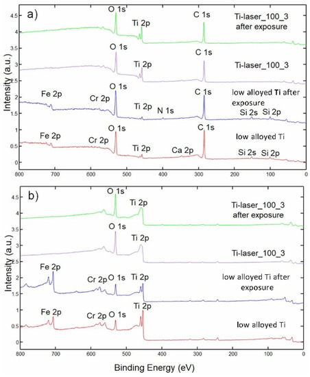 Survey spectra for low alloyed Ti and that after exposure to the corrosive environment were similar (Figure 6a). No obvious difference in the survey spectra can be observed. Signals of O 1s, Ti 2p and Cr 2p, Fe 2p, Si 2p, Si 2s, as well as C 1s and Ca 2p, were present on the surface of low alloyed Ti (Figure 6a). This shows that surface treatment of low alloyed Ti sample yields Fe and Cr elements on the surface. At the surface of laser marked surface (Ti-laser_100_3) and exposed to corrosive environment only O, Ti and C were present with minor traces of N (Figure 6a).
