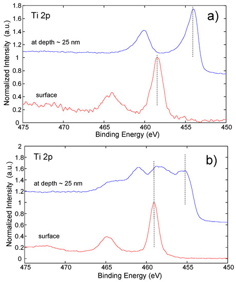 Figure 7 shows high energy resolution Ti 2p spectra of low alloyed Ti before exposure to 0.1 M NaCl solution and of laser marked Ti surface Ti-100-3 before exposure to 0.1 M NaCl solution at the surface and at a depth of 25 nm. The Ti 2p3/2 peak on the surface of both samples is at 458–459 eV what is assigned to Ti(4+) oxidation state in the surface TiO2 oxide. After sputtering at depth of 25 nm on the laser non-marked sample Ti 2p3/2 peak was at 454 eV (Figure 7a) showing metallic phase of Ti. On the laser marked sample at depth of 25 nm Ti 2p3/2 peak showed many subpeaks ranging from 454 to 459 eV (Figure 7b) presenting different Ti-oxidation states from Ti(0) to Ti(4+). Such mixed spectrum of Ti oxidation states is a typical result of ion sputtering of TiO2 when the reduction of Ti(4+) state is a consequence of preferential sputtering of oxygen from TiO2 oxide [38]. However, also in this case, TiO2 was present at depth of 25 nm which was the maximum depth reached during depth profiling.