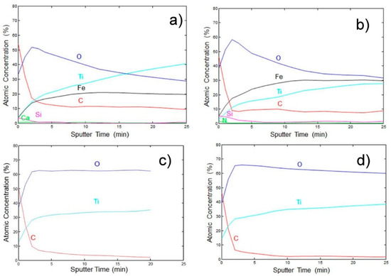 Figure 8 shows the XPS depth profiles of four analysed samples presenting changes in chemical composition with a depth of up to ~25 nm. In Figure 8a,b, no curves for Cr are presented (~10 at %) although Cr was present in the surface layer, as proved by analyses after XPS depth profiling (Figure 6b). From Figure 6a, it follows that low alloyed Ti sample was covered by a ~10 nm thick mixed TiO2/FeCr oxide layer (Figure 7a). On the surface, some traces of Ca and Si were also found. Beneath the surface oxide layer, a Ti–(Fe/Cr) layer was present. In the subsurface region oxygen and carbon concentrations did not decrease to 0% but they persist at significantly high level. We explained the presence of O and C as adsorption of O- and C-based species from residual vacuum atmosphere to fresh and very reactive Ti surface which was exposed during Ar bombardment. In addition, the relatively rough sample surface produced by shot peening induced shadowing effects for Ar ion bombardment resulting in not complete and non-uniform removal of adsorbed layer of O and C species. The adsorption effect of C and O was observed for all four samples being larger for laser non-treated samples (more metallic composition) than for laser treated samples containing less reactive surface oxide layer (described below).