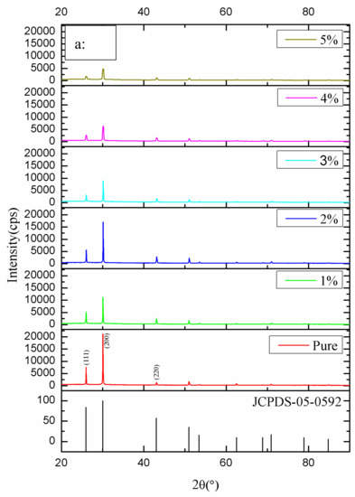 where n = 1, λ = 1.54056 is the wavelength of the X-ray, and θ is the diffraction angle. We observed that the calculated plane spacing value and the lattice constant match the card JCPDS: 05-0592. The calculated interplanar spacing and lattice constant decreased with increased Cr doping, which may be due to lattice compression caused by crystallization and stress.