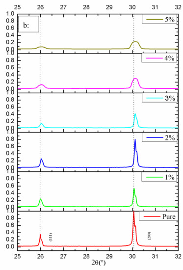 can be used to calculate the grain size of PbS nanofilm samples (θ is the Bragg diffraction angle, β is the full-width at half-maximum (FWHM), and λ is the X-ray radiation wavelength). Table 1 shows that the nanofilm grain sizes decreased with increasing Cr doping levels. As observed in Figure 1b, the shape of the XRD line indicated a significant broadening after doping due to a grain size decrease with increasing Cr doping, which broadened the diffraction peak of the PbS film. Preetha believes that, as the relative concentration of Cr decreases, the grain size increases; this observation is in good agreement with our experimental results [1]. Equation (8) [21],