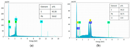 EDS of pristine PbS films: (a) 0 at.% Cr-doped PbS film, and (b) 5 at.% Cr-doped PbS film.