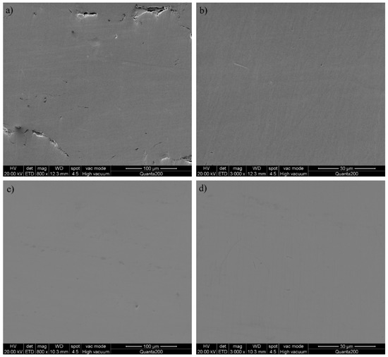 Surface morphologies of substrate specimens: (a) No. 1 at 800 magnification, (b) No. 1 at 3000 magnification, (c) No. 9 at 800 magnification, (d) No. 9 at 3000 magnification.