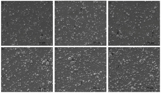 Figure 1 shows the surface morphologies of number (No.) 1 and 9 substrate specimens after polished. The surface morphologies of other substrate specimens are not listed here. From Figure 1, it can be obtained that there are some voids, high-density dimples, and even cracks in the surface of the substrate, even though the substrate is polished. Different SLM process parameters result in different hole and crack conditions [1]. The cracks, voids, and dimples exist in the No. 1 substrate specimen while only some voids and dimples exist in the No. 9 substrate specimen. Figure 2 shows the surface morphology of coating specimens. From Figure 3, it can be obtained that there are macro-particles in different sizes and pin holes dispersed on the surface of the TiAlN/TiN multilayer coating [18]. The arc discharge on the target surface produced metallic macro-particles which were splattered onto the coating surface during deposition. The spalling of macro-particles by re-sputtering, and/or collision, thus, a few pin holes were left on the surface of the coating. The size of the macro-particles was less than 10 μm. In Figure 2, there was not much difference in the surface morphology of each specimen, but there were relatively more and larger particles in Figure 2d–f.