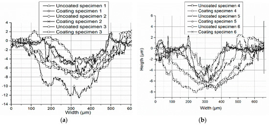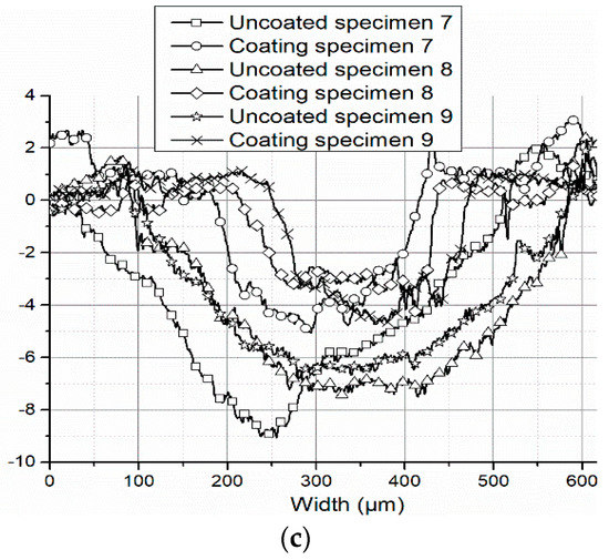 The significant difference on profiles of wear track for the specimens can be seen in Figure 6. Compared with the uncoated specimens, the widths of the wear tracks of the coating specimens are narrower and the depths are shallower. Visually, it means that the wears of coating specimens are much less than that of uncoated specimens. In addition, both sides of the wear track of the coating specimens were steep, perhaps because during the wear test, the coating was worn out, and the microhardness of the substrate exposed at the bottom of the wear track was too low to anti-wear, compared to the coatings on both sides of the area. The wear tracks of the uncoated specimens with different process parameters were different, but both were wide and deep. The deepest values of all of wear tracks of the coating specimens exceeded 3 μm, which also indicated that the coating had been worn through, and that was consistent with the results of the EDS analysis.