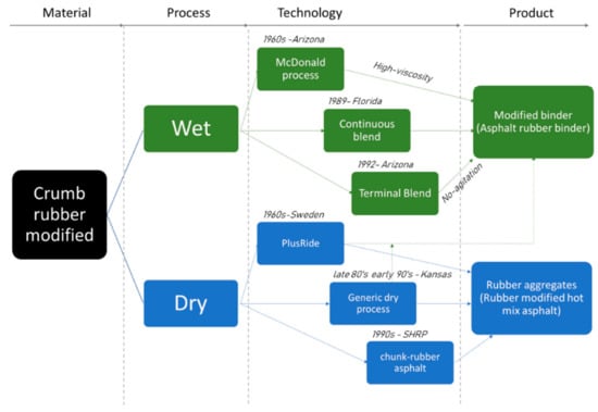 Principal materials, processes, technologies, and products for the use of reclaimed rubber in road materials. Note: Greenbook (2006) proposes three types of production processes: (i) wet process; (ii) dry process; (iii) terminal blend process.