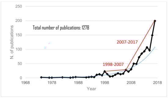 The analysis of Figure 2 shows the increase in the number of publications regarding CR from 1970 up until 2018. Specifically, 1995 marks the real beginning of scientific interest in this field, probably due to the market entry of different products in the years before (Continuous Blend, Terminal Blend, Generic dry process, and chunk-rubber asphalt). The years between 1998 and 2007 register a change in the tendency observed previously, which may suggest that the research interest in the topic may have reached its maturation point. From 2007–2008 up until now, there is clearly a sharp increase (exponential) in the number of publications. This tendency suggests the influence of different aspects; one of these is surely the general increase in the number of publications in the academic domain. Nevertheless, the increase of the scientific interest for this kind of material is also due to the policies and consequently the markets that believe in the feasibility of the use of reclaimed rubber in engineering construction and intensively support the research in this direction.