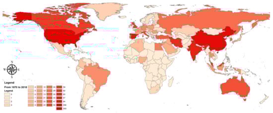Figure 3 shows the world map related to the spatial distribution of the scientific interests as the number of publications from the 1970s up until now for each country. The countries are color-scaled, from white, corresponding to zero publications, to red, which corresponds to the country with the highest number of publications related to the use of CR.