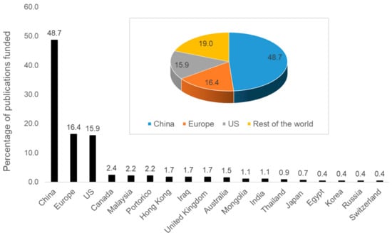 Figure 4 shows that China supports research related to the reuse of reclaimed rubber with almost 50% of the publications. Europe and the United States are far behind, with approximately the same percentage of publications that received funding (16.4% for Europe and 15.9% for the United States, respectively). Note that the results are not exhaustive because in certain regions, academia does not work parallel to the industry. Therefore, there might be some interests in the industry that are not reflected in the number of publications.