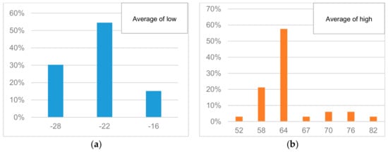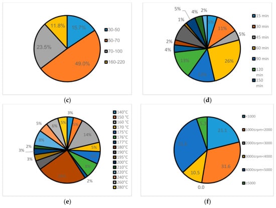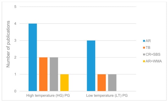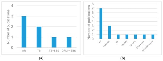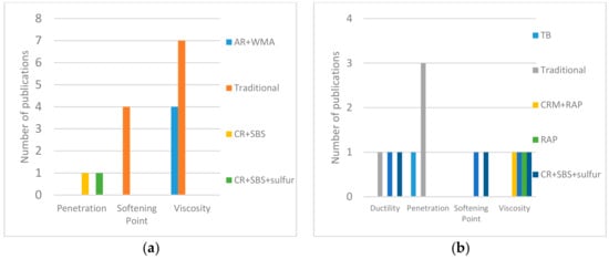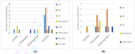 - The most-used quantity of rubber falls in the interval between 15% and 20%, and a significant number of research works continue using a percentage between 5% and 20% (Figure 5a). Only a few attempts have been made with higher quantities (20%–35%). This means that the “safety point” of rubber used in the modified binder has a threshold of 20%. In the framework of this paper, “safety point” is related to the most-used quantity of rubber for research purposes. Higher quantities of rubber make the binder stiff and inappropriate for road applications. Therefore, higher rubber quantities are still not used.