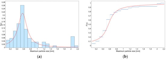Figure 6. (a) Probability density function and (b) cumulative distribution function of the rubber particle size. - The base bitumen is a standard bitumen with penetration of 50–70 dmm. Less used is the 70–100 dmm, while extremely stiff or soft bitumen are rarely used for this application (Figure 5c). This is probably due to the fact that stiffer or softer binder are less used for the traditional bituminous mixtures, therefore they are also less used for road applications with alternative materials.