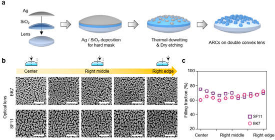 Figure 3a depicts the schematic illustration of the ARCs fabrication process. We exploited a simple fabrication strategy which was lithography-free. Furthermore, our fabrication process was also available to most types of SiO2-based lenses by the same process, due to a refractive index of SiO2 with almost no difference compared to other SiO2-based lenses. A SiO2 layer of 150 nm was deposited for anti-reflection structures via RF sputtering. As optical lenses are composed of various materials as well as pure SiO2, the etching rate differs from each other. Therefore, we introduced a SiO2 layer to fabricate ARCs under the identical condition for simple and universal applications. In order to form Ag nanoparticles, a thin Ag film of 10 nm was deposited via an electron beam evaporator, and then the film was thermally dewetted for a hard mask by rapid thermal annealing (RTA) at 500 °C for 1 min with a N2 ambient of 200 mTorr. Reactive ion etching (RIE, Oxford Plasmalab 80 Plus, Abingdon, UK) was subsequently performed to fabricate a truncated cone of SiO2 where the CF4 flow, chamber pressure, temperature, and RF power were 50 sccm, 30 mTorr, 23 °C, and 100 W, respectively. After SiO2 etching, Ag residues were removed via nitric acid (HNO3) for 1 min at room temperature. Finally, the fabricated optical lenses were cleaned using acetone, isopropyl alcohol (IPA), and deionized (DI) water, and dried with N2 blowing. These steps were repeated for the other side of the optical lens. Figure 3b presents the SEM images of the top view in terms of position at the center, right-middle, and the right edge. As shown in Figure 3b, the nanostructures were fairly well-formed on the surface of both the BK7 and SF11 lenses. Figure 3c exhibits the filling fraction in terms of position in Figure 3b. Both DARCs lenses, BK7 and SF11, were implemented with nanostructures having a filling fraction between 60% and 80%. The size distribution and fast-fourier transform (FFT) profiles were plotted to figure out the nanostructure geometry on the lens depending on the position, in Figure S7.