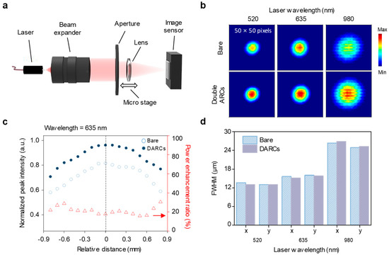 (a) Schematic illustration of optical setup for estimating the imaging characteristics of a single lens. (b) Beam profile (50 × 50 pixels; 83.5 μm × 83.5 μm) of a single SF11 bare lens and SF11 DARCs lens using various laser diodes with wavelengths of 520, 635, and 980 nm. (c) Plot of normalized peak intensity and power enhancement ratio of a SF11 bare lens and DARCs lens as a function of the relative displacement of the lenses. Dashed line shows unchanged focal length. (d) Comparison of full width at half maximum (FWHM) in Figure 4b in terms of x and y directions.