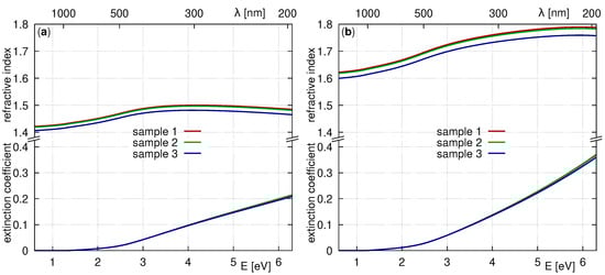 To interpret the experimental data, it was necessary to assume that the non-stoichiometric silicon nitride films are inhomogeneous and that they also exhibit uniaxial anisotropy. The inhomogeneity of the films was modeled by considering the profiles of the dispersion parameters given in Equation (39). Two values must be provided for each dispersion parameter, one specifying its value at the upper boundary of the film (i.e., for ) and one specifying its value for . Moreover, the number of dispersion parameters was further doubled due to the uniaxial anisotropy because a separate set of dispersion parameters must be used for the ordinary and extraordinary dielectric functions. The dielectric function given in Equation (31) is a function of eight dispersion parameters, therefore parameters were used to describe the profile of the dielectric tensor. If all of these parameters were considered to be independent, the model would be overparameterized. Therefore, it was necessary to reduce the number of parameters sought in processing of the experimental data. It is reasonable to expect that the inhomogeneity of the film and the uniaxial anisotropy are relatively weak effects. Thus, it is possible to assume that some of the dispersion parameters do not exhibit profile (i.e., they have the same value at the upper boundary and for ) and that some dispersion parameters have the same value for the ordinary and extraordinary dielectric functions. Even though the number of the parameters sought was reduced in this way, there were still enough degrees of freedom left to successfully interpret the measured experimental data.