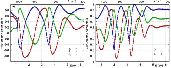 To describe the dielectric response of media with uniaxial anisotropy, it is necessary to specify the ordinary and extraordinary dielectric functions. Both the dielectric functions are calculated using the model given in Equation (31) but each uses a separate set of dispersion parameters: the parameters are used for the ordinary dielectric function and the parameters are used for the extraordinary dielectric function. Therefore, the ordinary and extraordinary dielectric functions can be written as