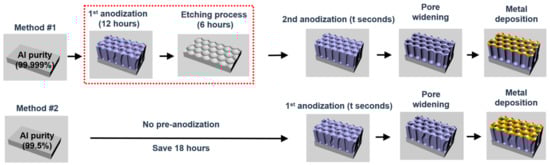 Comparison of the highly ordered anodic aluminum oxide (HO-AAO) fabrication method (method #1) and the one (QU-AAO) developed in this work (method #2). Method #1 begins with a high purity aluminum substrate (99.999%), followed by two anodization steps and a wet etching procedure between them. Metal deposition is performed either directly after the second anodization process or after pore widening process. On the other hand, method #2 uses an inexpensive aluminum substrate (99.5%) and reduces the two anodization steps into one, removing the etching process, thus finally reducing the minimum fabrication time by 18 h and saving 30 times cost.