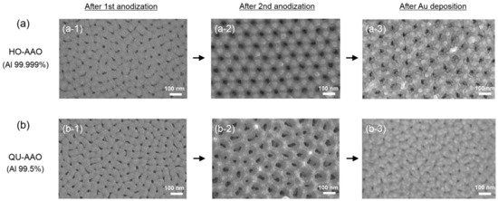 Aluminum (Al) sheets with the purity of 99.999% (Sigma-Aldrich, Saint Louis, MO, USA) and 99.5% (Sigma-Aldrich) were prepared to compare the morphological and optical properties of the nanostructures. To remove the existing oxide layer and smoothen the rough surface, an electropolishing process was applied to the pristine Al substrate prior to any anodization process. This process was done by immersing the substrate into a mixture of perchloric acid (SAMCHUN, Seoul, Korea) and ethanol (HClO4:C2H5OH = 1:4 volumetric ratio) and connecting it to the positive terminal of a 20 V DC power supply (i.e., an anode) at a temperature of 7 °C while a platinum plate was connected to the cathode terminal. The distance between electrodes was about 2 cm. When DC voltage was applied, the metal surface was dissolved into the electrolyte while a current flowed from the anode to the cathode. After the electropolishing process was carried out for 3 min, the substrate was anodized in a 0.3 M oxalic acid (SAMCHUN) electrolyte at 40 V and 15 °C (anodization process). During the anodization time, a porous alumina layer grew, where the thickness varied from a few nanometers to several hundred micrometers. The wet etching process required for HO-AAO templates was performed for ~6 h inside in a mixture of 1.8 wt.% chromic acid (JUNSEI, Tokyo, Japan) and 6 wt.% phosphoric acid (DAEJUNG, Siheung, Korea) at 65 °C. The pore widening process occurred in 0.1 M phosphoric acid at 30 °C. As a flexible form, 500 nm thick Al was deposited on a polyethylene terephthalate (PET) substrate. The first-step anodization of Al under the same condition above provides a QU-AAO with an Al layer at the bottom. The size we used was 1 cm × 5 cm, but this could easily be scaled up. For the metal deposition, a thermal evaporator was used (10−5 Pa, 15 min).