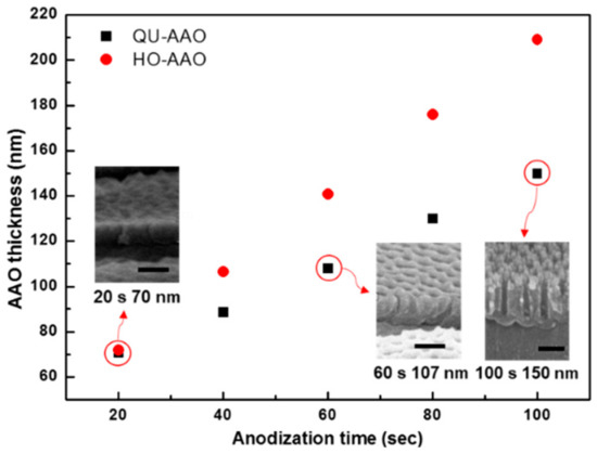 AAO thickness as a function of anodization time. The thickness increases linearly for both of the templates and HO-AAO (red dot) grows faster than QU-AAO (black dot). Insets are cross-section FE-SEM images for QU-AAO templates. The scale bar was 100 nm.