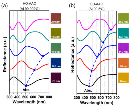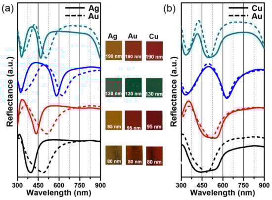 Gold, silver, and copper are typical coating materials that are widely used in plasmonic applications [41,42,43,44]. While gold is more stable in air than the other materials, silver provides better absorption than gold at certain wavelengths, and copper is the most cost-effective of the materials. We tested the effect of different coating materials on the optical properties of QU-AAO templates with various alumina thickness without the pore widening process. Figure 7a exhibits the reflectance spectra in the case of silver (solid lines) and gold (dashed lines). The spectra look similar to each other, except that the absorption bands of silver occur at shorter wavelength of ~100 nm relative to gold, where the difference becomes smaller as the alumina layer becomes thicker. On the other hand, the reflectance spectra of copper (solid lines) and gold (dashed lines) in Figure 7b show almost identical wavelength dependence. The differences in Figure 7 are commonly observed in reflectance measurements on these materials which result from the absorption occurring at similar wavelengths for gold and copper, but at shorter wavelength of ~100 nm for silver.