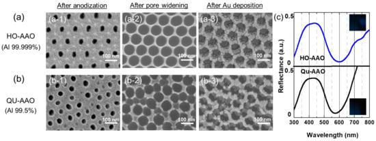 The optical property may also depend on the pore size. At this time, we implement the pore widening process and test the absorbance spectrum as a function of the pore size. Figure 5a,b shows FE-SEM images of the HO-AAO and QU-AAO templates after anodization, pore widening, and gold deposition. For the templates, we perform the widening process for 70 min in phosphoric acid. As seen in Figure 5(a-2,b-2), a highly ordered honeycomb array is obtained for HO-AAO, whose average pore diameter is about 80–85 nm, while nanopores with an irregular pattern and pore diameter are obtained for QU-AAO. Finally, a 20 nm gold layer is deposited on the templates, which could be seen to be accumulated around the rim and bottom of nanopores (Figure 5(a-3,b-3)). The reflectance spectra in Figure 5c show almost identical optical responses and color images between the templates, which would allow dissimilar spectra without the pore widening process. This informs that controlling pore size can also be an effective way to tune the optical properties of the nanostructures. Furthermore, after widening, their optical characteristics could be almost identical due to the similar effective dielectric constant, which can be calculated by the thickness and pore size of AAO. In other words, although the uniformity of pores was broken, their effective dielectric constants, , which were determined by the area ratio (i.e., porosity) between the air and AAO medium (), became similar by widening process, so that their optical behavior could be identical on AAO-based plasmonic nanostructures [38,39,40].