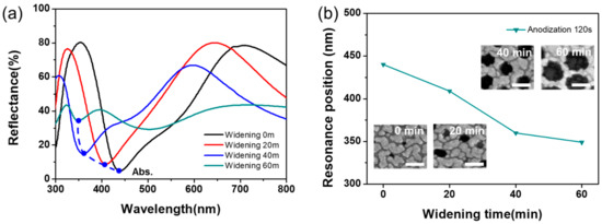 As shown in Figure 4, the resonance peak shifts towards a longer wavelength as the anodization time increases (i.e., as the layer becomes thicker), where the resonance peak was defined by the plasmonic interference coupled absorption position (see the dot line). The thickness dependence can be understood such that constructive interference occurs at a longer wavelength in a thicker alumina layer. These behaviors were already studied in our previous paper, where absorption peaks were related to the coupling effect of the constructive interference and localized surface plasmon resonance (LSPR) according to the thickness of an alumina layer [38,39,40]. For more quantitative analysis on the pore size dependence, we plotted the resonance peak in the absorption band as a function of the pore widening time for the QU-AAO, with the anodization time of 120 s in Figure 6. The inset in Figure 6b shows the FE-SEM images of the top view for silver coated QU-AAO structures. As the widening time increases, the resonance peaks decreased, which is an opposite trend when compared to the case of thickness. The widening process enlarges the pore, but at the same time reduces the area between the pores (which we call a terrace), where most of the gold is deposited. Therefore, we think that the blue shift of the resonance peak does not result from the increase in pore diameter (i.e., a decreasing effective dielectric constant) but from the decrease in terrace area. Through the combination of varying the layer thickness and pore size, we can effectively control the optical properties of AAO devices in much more cost-efficient ways.