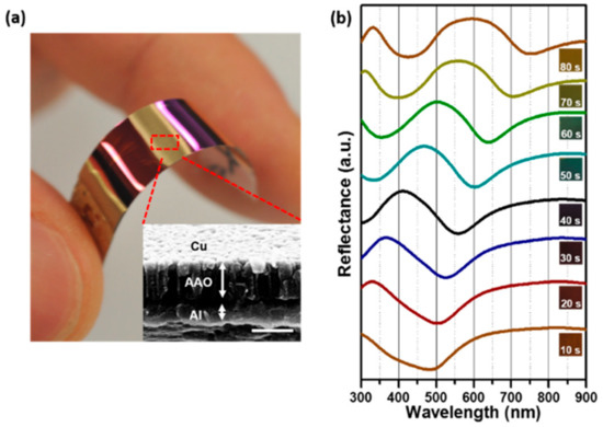 Figure 8a finally demonstrates that we can realize large-area and flexible plasmonic nanostructures in a cost-efficient way with copper. We deposited a thin Al film of about 500 nm in thickness on flexible polyethylene terephthalate (PET) and then anodized it to produce a QU-AAO template. We controlled the anodization time to obtain different QU-AAO thicknesses for different optical behaviors. Then, a copper layer of 20 nm thickness was deposited to provide plasmonic effects. As shown in Figure 8b, their optical behaviors are well-tuned according to the anodization time. As mentioned earlier, HO-AAO requires a long etching process and loses much of the Al layer (hundreds of micrometers in thickness). On flexible substrates, we could not process such an etching process because the deposited Al could be normally under micrometer scale. Thus, we needed to understand the optical behaviors using QU-AAO to accomplish flexible plasmonic devices.