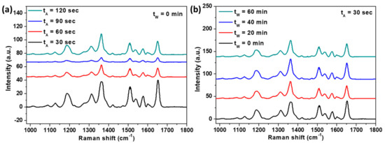 SERS spectra with R6G dye molecules as a function of (a) anodization time and (b) pore widening time. (a) QU-AAO templates with the widening time of 0 min are used; (b) QU-AAO templates with an anodization time of 30 s are used. The concentration of R6G was 100 µM.