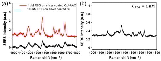 SERS spectra for enhancement calculation and detection limit. (a) SERS spectra of R6G on Ag coated QU-AAO (the red solid line, CR6G = 1 µM) and on Ag coated Si (the black solid line, CR6G = 10 mM). From the three main peaks in the Raman spectrum (1185, 1365, and 1650 cm−1), we obtained a SERS enhancement factor of ~0.2 × 105. The fabrication conditions for the HU-AAO are an anodization time of 30 s, a pore widening time of 0 min, and the deposition of a 20 nm Ag layer; (b) SERS spectrum for 1 nM R6G on Ag coated QU-AAO.
