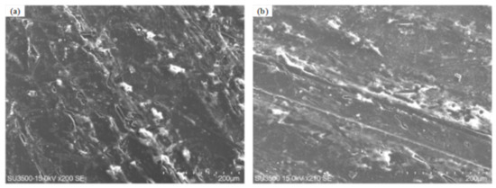 Figure 5 shows SEM images of CF-PEEK composites against 17-4PH stainless steel and four kinds of cermet coatings at the 100 N applied load and 300 r/min rotational speed lubricated with water. It can easily be seen that the worn surface of CF-PEEK/Al2O3-13%TiO2 tribopair is smoothest, and only a spot of CF-PEEK debris can be observed (Figure 5e). As illustrated in Figure 5a,b, some carbon fibers were exposed to the contacting surface as a result of abrasive wear and slight adhesion wear. When sliding against WC-10Co-4Cr, it can be seen from Figure 5c that the CF-PEEK contacting surface was characterized by severe plastic deformation and partly broken due to the grinding process. As shown in Figure 5d, CF-PEEK exhibited serious adhesion wear for the Cr2O3 coating, and large patches of deformed layers (caused by softened matrix material) covered the worn surface, which caused some CF-PEEK composites to tear apart. This is related to the relatively high surface hardness of Cr2O3 coating (about 1620 Hv) compared to those of 17-4PH and other cermet coatings, which could lead to the severe wear of the soft CF-PEEK composite. Therefore, it can be concluded that the large hardness difference between the CF-PEEK and cermet coatings could accelerate the wear of the soft CF-PEEK.
