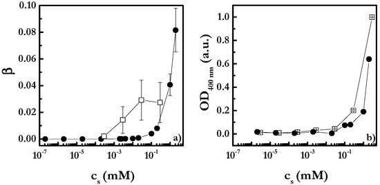 Figure 1b shows the dependence of the optical density of the samples on the surfactant concentration for the solutions of PDADMAC and the two surfactants. Similar qualitative concentration dependences of the optical density were found for both polyelectrolyte-surfactant systems. It may safely be expected that all of the studied compositions for PDADMAC-surfactant solutions fall in an equilibrium one-phase region, showing optically transparent solutions. This comes from the fact that the number of surfactant molecules available in solution is not high enough to neutralize the charge of all the monomers in the polyelectrolyte chains, thus leading to the formation of undercompensated cationic complexes in solution. Indeed, considering the high polymer concentration, simple calculations suggest the existence of around 36 monomers for each surfactant molecule for a surfactant concentration of approximately 1 mM. Therefore, assuming the complete binding of surfactant molecules to the polymer chains, around 35 monomers remain positively charged in the complexes, supporting the formation of transparent samples within the entire concentration range. However, contrary to what was expected for solutions with compositions far from the neutralization, the solutions formed by undercompensated complexes show an increase of the turbidity for the highest surfactant concentration. Therefore, for such concentrated solutions, the system should get close to the onset of where the two phase region occurs, even though no signature of charge neutralization was found from electrophoretic mobility measurements. This results from the mixing protocol used for solution preparation, which proceeds during the initial step by mixing a concentrated polymer solution with a concentrated surfactant solution. This precursor solution is them diluted up to the stated bulk composition. It may be expected that this methodology leads, due to the Marangoni stress created, to the formation of persistent kinetically-trapped aggregates that persist even upon dilution, leading to the appearance of a two-phase system far off the real neutralization point of the system [,]. These results contrast with those reported in other mixtures studied in the literature. In such systems, the increase on the optical density of the samples results from the formation of charge compensated complexes. The last is associated with the transition from a composition region, in which the charge of the complexes is governed by the excess of charged monomers to another region, in which the excess of bound surfactant to the polymer chain controls the charge of the formed complexes, i.e., a charge inversion transition [,,]. The above results show that the production of kinetically-trapped aggregates during mixing can lead to turbid mixtures far from the real equilibrium phase separation []. Preliminary results have shown that the above discussed scenario changes significantly when the interaction of PDADMAC with betaine derived surfactants is considered. In such systems, even the polyelectrolyte-surfactant interactions occur through the negatively charged group in the terminal region of the polar head, the formation of kinetically-trapped aggregates is hindered, probably as a result of the electrostatic repulsion associated with the positively charged groups in the zwitterionic surfactant [].