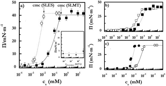 The adsorption behavior of SLMT and SLES is the expected for typical ionic surfactants. The Π increases with the bulk concentration up to the point that the surfactant concentration overcomes the threshold defined by the critical micellar concentration (cmc). Afterwards, Π remains constant with further increases of surfactant concentration. It is worth mentioning that the results obtained using different tensiometers (surface force tensiometer with Pt Wilhelmy as a probe plate and drop profile analysis tensiometer) agree within the combined error bars for the adsorption of both surfactants at the water–vapor interface. The surface pressure isotherms allow one to estimate the cmc of the pure surfactants, which showed values of around 10−2 and 10−1 mM for SLES and SLMT, respectively.