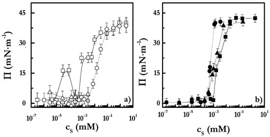 The comparison of the results obtained for the adsorption of pure surfactants at the water–vapor interface with those obtained for the adsorption of PDADMAC-surfactant solutions shows that for the lowest surfactant concentrations the surface pressure values are similar for pure surfactant and polyelectrolyte-surfactant solutions. This is the result of the low coverage of the interface (see Figure 2b,c). In such conditions, the surface excess is not high enough to produce any significant change in the surface free energy, and hence the Π values remain close to those of the bare water–vapor interface. The increase of the surfactant concentration leads to the increase of Π for both surfactant and polyelectrolyte-surfactant solutions. This increase starts for surfactant concentrations around one order of magnitude lower when polyelectrolyte-surfactant solutions are considered, which is a signature of the existence of a synergetic effect for the increase of the surface pressure as a result of the interaction in the solution of the polyelectrolyte and the surfactant. This is in agreement with previous results reported in the literature for several polyelectrolyte-surfactant systems [,,,]. The above-mentioned synergetic effects do not influence the adsorption behavior of solutions formed by PDADMAC and zwitterionic surfactants derived from the betaines, as was shown in preliminary results. This could be ascribed to the aforementioned differences in the aggregation process occurring in the bulk [].