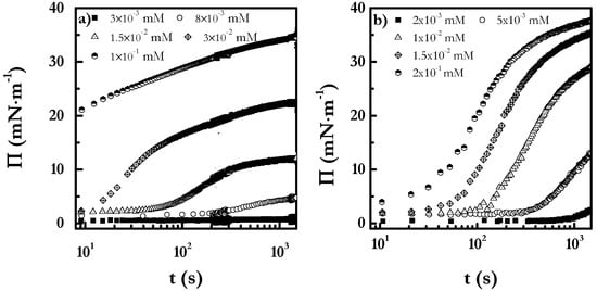 The analysis of the adsorption kinetics of polymer-surfactants at the water–vapor interface is a powerful tool for deepening the understanding of the mechanistic aspects of the adsorption of complexes. This is done by studying the time evolution of the surface pressure (dynamic surface pressure) during the adsorption process. The adsorption kinetics have been measured using a drop shape analysis tensiometer. As expected, the adsorption of polymer-surfactant solutions at fluid interfaces is slower than that corresponding to pure surfactant [,]. Figure 4 shows the dynamics surface pressure obtained for the adsorption of PDADMAC-SLMT and PDADMAC-SLES solutions at the water–vapor interface.