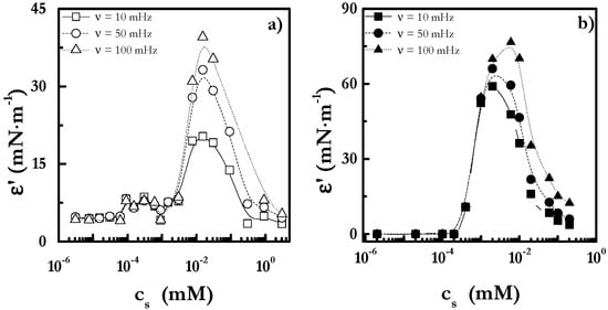 The above discussion was devoted to the study of the adsorption at interfaces with fixed surface areas. However, from a technological point of view, the understanding of the response of the interface against external mechanical perturbations is essential because this provides important insights into the relaxation processes involved in the equilibration of interfacial layers [,,,]. The dependences of the dilational viscoelastic moduli (ε′ represents the dilational elastic modulus and ε″ the viscous modulus) on the surfactant concentration and the deformation frequency provide complementary information for the better understanding of the complexity of the mechanism involved in the equilibration of the interfaces, helping to give a more detailed picture of the physical processes governing the formation of adsorption layers from polymer-surfactant solutions []. It must be stressed that for both PDADMAC-SLMT and PDADMAC-SLES solutions, the values of ε″ are negligible in relation to those of ε′, with the ratio ε″/ε′ decreasing as the surfactant concentration increases. Hence, for the sake of simplicity only the behavior of ε′ will be discussed. Figure 5 shows the concentration dependences of the elastic modulus for PDADMAC-SLMT and PDADMAC-SLES layers.