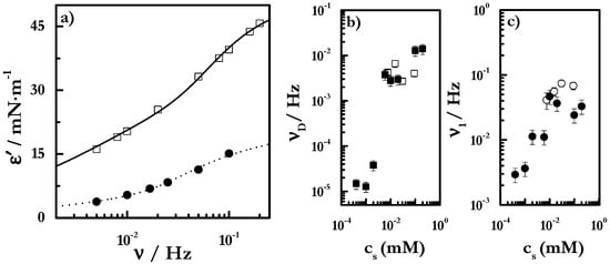 (a) Examples of frequency dependences of the elastic modulus for interfacial layers of PDADMAC-SLMT (□) and PDADMAC-SLES (●) and for solutions with surfactant concentration of 0.1 mM. Symbols represent the experimental data and the lines are the theoretical curves obtained from the analysis of the experimental results in term of the theoretical model described by Equation (2). (b) Concentration dependences of νD for PDADMAC-SLMT (□) and PDADMAC-SLES (■). (c) Concentration dependences of ν1 for PDADMAC-SLMT (○) and PDADMAC-SLES (●). (b,c) Symbols represent the experimental data and the lines are guides for the eyes. The results correspond to PDADMAC-surfactant mixtures containing a fixed PDADMAC concentration of 0.5 wt.%, and left to age for one week prior to measurement.