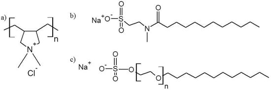 PDADMAC, with an average molecular weight in the 100–200 kDa range, was purchased as a 20 wt.% aqueous solution from Sigma-Aldrich (Saint Louis, MO, USA), and was used without further purification. SLES was supplied by Kao Chemical Europe S.L. (Barcelona, Spain) as an aqueous solution of surfactant concentration 70 wt.% and was purified by lyophilization followed by recrystallization of the obtained powder using acetone for HPLC (Acros Organics, Hampton, NH, USA) []. SLMT was synthetized and purified following the procedures described in a previous study []. Scheme 1 shows the molecular formula for PDADMAC and the two surfactants used in this work.