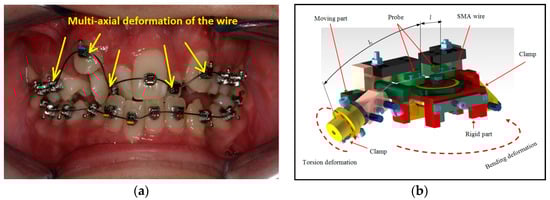 (a) Fixed orthodontic appliance (arrow pointing to the bending and torsional stresses of the archwire); (b) Simulation of multiaxial stress equipment (SMAS) [23]. Reprinted with permission from [23]. © 2014 Elsevier.